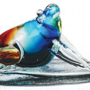 For all you Art Glass Collectors, here is a beauty you will appreciate. A striking glass sculpture of a squatting frog on an impressive luxurious-sized , heavy weighted thick solid glass base. The frog itself is magnificently crafted of brilliant , iridescent shades of blue, gold and clear glistening glass. Wherever this stunning piece of art glass is placed, it will definitely be an eye-popper. A MUST Have for the collector of fine-quality craftsmanship of Unique Art Glass!!