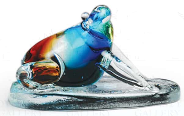 For all you Art Glass Collectors, here is a beauty you will appreciate. A striking glass sculpture of a squatting frog on an impressive luxurious-sized , heavy weighted thick solid glass base. The frog itself is magnificently crafted of brilliant , iridescent shades of blue, gold and clear glistening glass. Wherever this stunning piece of art glass is placed, it will definitely be an eye-popper. A MUST Have for the collector of fine-quality craftsmanship of Unique Art Glass!!