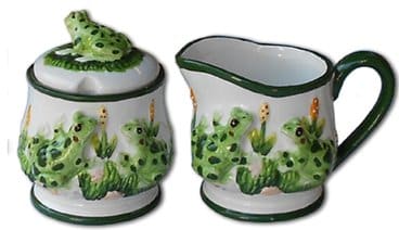 You will proud to display this beautiful ceramic set at any table setting. The lidded sugar jar is white with green trim. It is fully embossed around the entire front with two frogs perched among colorful flowers. On top of the jar sits another embossed single frog on a lily pad.The creamer is designed with matching embossing. A Truly Impressive addition to your table.