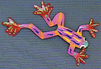 Gorgeous rain forest frog metal art wall plaque. This is beautiful art is hand pounded and hand painted to make a realistic look of a rain forest frog. Cool pink, red &orange shades make this frog come to life. Has a clip on the back side for easy mounting. Assorted colors.