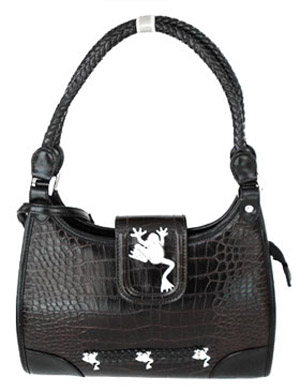Fully designed in midnight black, is this elegant crocodile faux leather frog handbag. It is embellished on the front with a large two inch silver-toned frog with crystal eyes, and three smaller silver matching frogs, sitting atop of a braided woven leather band. The double strap handbag handle is also braided and woven. The bottom of the bag is equipped with four silver grommets to promote stability. Other lovely details feature a fully-lined patterned interior with a silky-like finish. Three inside compartments include one side zippered, and two slip-side pockets. A beautiful gift for thar special
