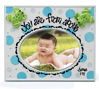 “You are from above” Picture Frame Spiritually inspired from the Book of James, Chapter One Verse 17.(1:17) Place a photo in this beautiful picture frame and jump for joy ! Cute green enamel frog will hold your favorite little photo. Hand-painted ceramic. Holds 4″ x 6″ photo.