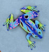 Gorgeous rain forest frog metal art wall plaque. This is beautiful art is hand pounded and hand painted to make a realistic look of a rain forest frog. Cool blue shades make this frog come to life.