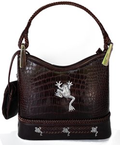 This is a lovely designed Dark, Chocolate Brown, Zippered Closure Handbag, both fashionable and functional. The front of the bag is embellished with a large, lustrious silver-toned Frog, with three smaller matching Frogs, sitting atop of a woven leather band, at the bottom. The handle is also of woven leather secured to the frame by two heavy -weight silver, swiveling adapters. Two more charming details include crystal eyes on all the frog ornaments, as well as four silver grommets on the bottom of the bag for stability. The back of the bag features an added,zippered closing compartment. The interior, all fully lined with a patterened silky-like finish, also has three added compartments: one, side zippered compartment and two slip-side pockets.The entire bag is crafted of Croc-style, very realistic faux leather, durable, easy to care for and extremely attractive to all who appreciate understated elegance. Bonus: Includes matching detachable cell phone holder.
