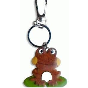 The frog is hand crafted from several different types of wood in different textures and colors then sanded smooth. The lily pad and eyes are painted. The keychain comes with a convenient clip so that you can attach your keys to a belt loop or purse strap.