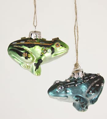 A set of two (2) glass, beautiful, Christmas Frog Ornaments. Designed in two shades of green, both frog ornaments, one, dark green, and the other, light green, are embellished with unique details. The bodies are enhanced with silver sparkles, beads and painting. They are most attractive, and a beautiful addition to any tree.