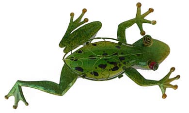 This is a very unique metal frog wall hanger. It is designed with a sparkling shade of green covering the frog’s body, with a transparent back, treated with scrolled metal, which also extends up to the large red glass eyes, also treated with the interesting and unique scroll work. Anywhere this beauty is hung, admiring comments will certainly prevail.