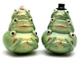 Here we have another addition to the Fairy Frog Porcelain Collectible Kitchen Wares. These unusual shakers are designed with three frogs stacked one on top of the other. The pepper dispensing frogs can be distinguished by the top hat won on top of the three fairy frogs. The salt shaker frogs have a pretty open lotus flower on top. They are made of hand-painted porcelain. Add this collectible from the Fairy Frog line, both attractive and functional.