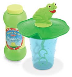 What kid doesn’t enjoy a fantastic bubble set? Well here it is–A big jar of bubble solution( 8oz), a lovely blue cup with a lily pad lid, and a colorful little smiling frog double ring wand. Dip the wand in the solution filled cop and bubble, bubble everywhere!! Lots of exciting joyous fun!! Adult supervision required.
