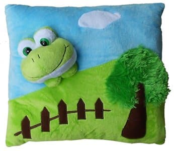 The happiest of frogs sits right in the corner of this super soft–super caresable–super plush beautiful pillow.