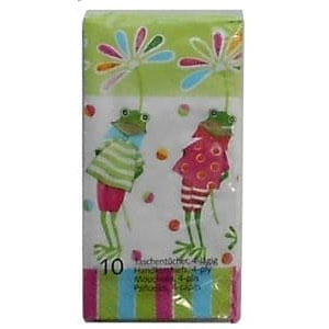 Adorable frog facial tissues.These are the pocket / purse size tissues. Each pack has 10 four ply tissues