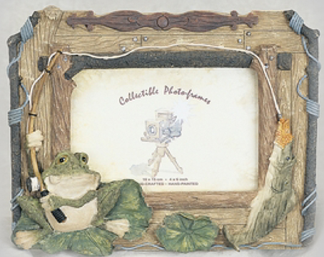 This is a Hand-Crafted, Hand Painted realistically detailed, rustic, sportsman’s frame. It depicts a 3-Dimentional Frog Fisherman reeling in his catch of 3-D fish on a white fishing line which stretches across the entire frame. Everything on the frame, including lily pad leafs, nailed wooden planks, poles with wrapped around rope and rod and reel, are all designed in 3-D life-like detail. What a wonderful frame for your frog enthusiast fisherman.
