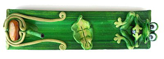 Made of resin/bamboo and beautifully hand crafted is this fantastic Flat Tray Incense Burner. It features a hand carved little green frog, with light green coloring for accent, holding a black shiny ball, reclining on the incense tray. The holder for the stick incense is detailed with a brown gem stone and scroll work surrounding it.