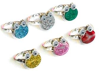 These very attractive glitter frog rings with wiggly eyes, make adorable party favors. They are made of silver painted plastic which actually resembles a metal ring. The plastic material stretches to accommodate different ring sizes. Both fashionable and fun! Comes in assorted great colors. Set of 6