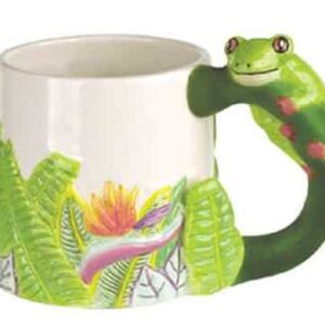 Start your day off with a friendly-eyed frog, serving you your morning coffee. He is perched on the handle of a lovely while mug, enhanced on the bottom with beautiful tropical flowers. You’re sure to HAVE A NICE DAY! .