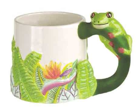 Start your day off with a friendly-eyed frog, serving you your morning coffee. He is perched on the handle of a lovely while mug, enhanced on the bottom with beautiful tropical flowers. You’re sure to HAVE A NICE DAY! .