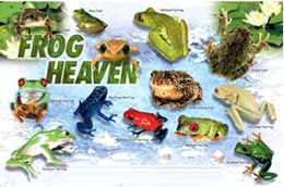 On a nice-sized plastic coated place mat you will find lovely illustrations of all the popular frog species, They are very educational, as well as entertaining for the frog lovers of all ages Both sides of the place mat are printed with the fantastic array of frogs.
