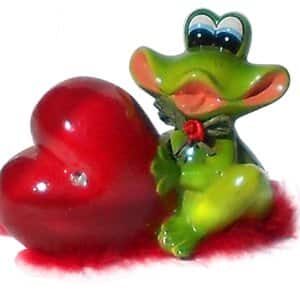 A green ceramic frog with bulging eyes and a pink wide grin is sitting on a furry red mat. He is holding out a big, bright red heart to his special someone. Is it YOU?