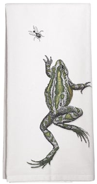 This luxury-sized white, 100% cotton Flour Sack Towel, measuring 30″ x 30″. was designed by Mary Lake. It depicts a handsome green frog displayed across the front of the towel, with a little fly tucked in the corner. Made of finest high-quality material.