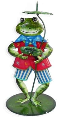 Bright striped pants, red jacket, blue polka dot scarf & bow tie–who wouldn’t fall in love with this big grinned, lovable frog? He stands on a round based pedestal, covering himself with his unique lily pad umbrella. Light up your life and add a lovely candle to top off his umbrella. Made of delightfully painted, glossy finish metal. Why not order a pair?