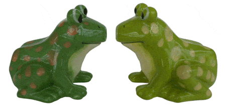 Two green glazed ceramic frogs, who can be separated from their kissing embrace, will gladly serve your salt and pepper seasoning before going back to clinging together in another kiss. The darker green frog is Peppy, and the light green spotted frog , is his girlfriend, Salty. A fun gift, and a great conversation piece for around the dining table.