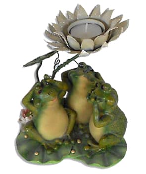 Using the themed “No Evil” scenario, three little happy frogs, surround the very pretty t-light flower shaped holder. They demonstrate the holding of ears,mouth and eyes, as they stand beneath the holder , on lily pads. Covering them is the white glittering pretty open-faced petal shaped holder. It has a little dragonfly on its stem, and another leaf, with a little ladybug on it. All, nicely detailed.