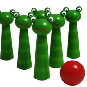 Six bright green frog pins and a little red ball will provide lots of challenging fun. Comes in a convenient net carrying bag. Line up the pins on a hard floor or tabletop. Then roll the ball, aiming at the front pin, to try and knock all the pins over. Move the ball further and further away to make the game more challenging. Keep score by the number of pins each person knocks over.