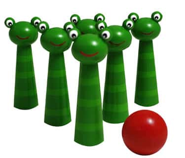 Six bright green frog pins and a little red ball will provide lots of challenging fun. Comes in a convenient net carrying bag. Line up the pins on a hard floor or tabletop. Then roll the ball, aiming at the front pin, to try and knock all the pins over. Move the ball further and further away to make the game more challenging. Keep score by the number of pins each person knocks over.