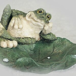 A frog sits atop a large Lilly Pad and beckons you to utilize his green pad as a colorful container. Placed on the bathroom vanity top, the container would make a perfect soap dish. It is even large enough to display a variety of guest soaps, if one wishes to.