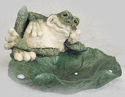 A frog sits atop a large Lilly Pad and beckons you to utilize his green pad as a colorful container. Placed on the bathroom vanity top, the container would make a perfect soap dish. It is even large enough to display a variety of guest soaps, if one wishes to.