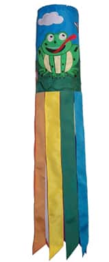 Beautiful colors and art work is this Applique and Embroidered Design Windsock. It depicts a happy, friendly frog who is anxious to catch that breeze and show his stuff for all to enjoy. Get him home and keep him flying.
