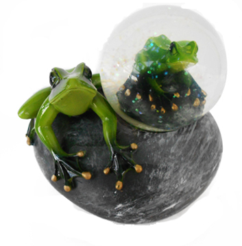 A large-sized clear round water globe, with green frog encased within its crystal waters, sits on a rock, shared by another green luminous frog. Placed on a home or office desk, it is a fun piece, as well as functional. It can serve as a perfect paper weight, to the frog lover in your life, and is just great to look at and turn over and over!
