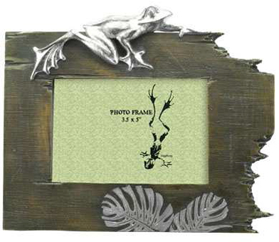 This is a beautiful, unique Photo Frame. It is designed to enhance your treasured photo in a casual yet elegant frame. Crafted with the look of aged, distressed wood, upon which is perched a realistic silver frog, reclining on the top, the frame is a perfect backdrop for that favorite photo. Two silver leafs also enhance the bottom of the frame. For gift-giving to that enthusiastic frog collector, or a treat to yourself.