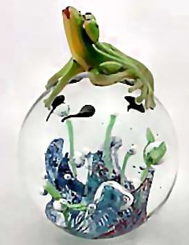 This unique paperweight features a lovely, hand blown , delightfully detailed Lorenzo glass frog. He is perched upon .a heavy-weight, clear glass globe. Inside the globe, swims five little black tadpoles, swimming above an array of pond plants and swirling bubbles–a very attractive setting. This cleverly designed piece will enhance either your home or office desk.