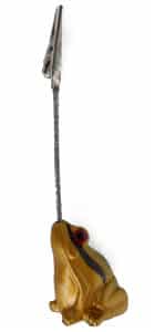 Supporting a metal vertical twisted wire post with a sturdy alligator clip attached for your photographs, is our little Shiny Poly Resin Frog. He is truly attractive with his iridescent red glistening eyes, and greenish gold coloring. Not only will he support your photos, but also your cards and recipes too.