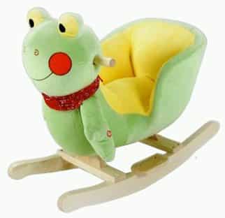 Fergie Frog, the Rocking Fun Toy, is the new Rockin’ Toy Sensation! Pure Delight is in store for every toddler who hops along on this whimsical hoppin’ fun frog! He is designed for comfort and safety, from his soft, sturdy, padded seat, sides, and high back, to his natural wooden base, and easy-grip wooden handles. He is constructed of soft, luxury plush material, which is sponge-washable. An absolute joy to behold with his dynamic colorful appearance. He is light green and yellow with big bulging eyes, big red embroidered cheeks, red embroidered nose and mouth, and a big red neckerchief tied around his neck. Sure to become an instant favorite!! Bonus—Press his velvety hand and Fergie responds with “Ribbit”-“Ribbit”. Recommended for children 18 months to 4 Yrs.