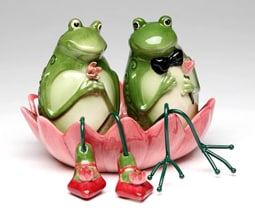 Two adorable green, glazed ceramic frogs sitting in their water lily tray are ready to have you shake them up a bit. They will add fun and enjoyment to any meal and they are certainly dressed for the occasion. The girl frog displays her vibrant pink shoes and the boy frog is sporting a black bow tie with a corsage.