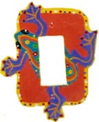 Haitian metal folk art is pounded out with a hammer and chisel from recycled steel drums. Hand painted in brilliant colors and made in Haiti. Single rocker switch plate will add hoppiness in any room. Assorted colors.