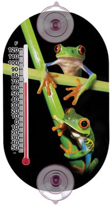 Indoor/Outdoor Thermometer measures 3.5 x 6.125 inches with suction cups at the top and bottom. fahrenheit scale to the left. Two bright green frogs on a dark background.