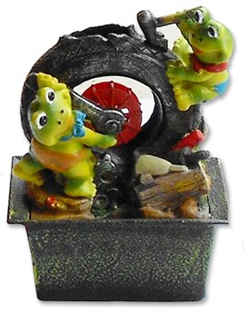 Frogs do everything in the water, so it comes as no surprise that these green friends turn wrenches in a fountain! 50,000 mile warranty NOT included. Water pump included. Runs on 2 “AA” batteries NOT included.