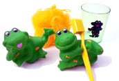 Set includes: Suction cup frog scrubby hanger. Scrubby. Suction cup toothbrush holder with toothbrush and cover, and a printed frog cup. Packaged in a clear vinyl bag with rope tie closure. Complete with a fill in the blank attached gift card.