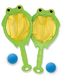 With our cool Froggy Toss and Catch Set, there are several enjoyable ways to explore using this exciting game. All instructions are included. The most popular game is to catch a “fly ball”. There are,of course, lots more ways to use your 2 froggy nets and 2 foam balls to have loads of fun and excitement.