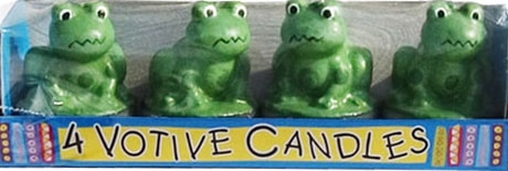 Box of 4 frog candles, each 2″ tall and 2″ wide.