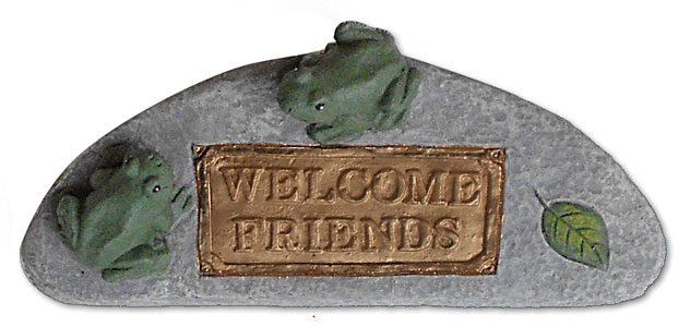Welcome Friends ! Very heavy resin sculpture with two frogs and a gold accented ‘sign’ reads ‘Welcome Friends’ Very suitable for outdoor use in your garden. It’s not really a rock but it sure looks and feels like one ! It’s heavy ! We wouldn’t be a bit surprised to find a real frog or two sitting on it in your lawn or garden. Made of Polystone.