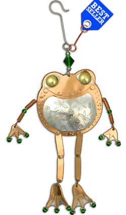 Shiny Metal double-sided, Christmas ornament, ready to hang on your tree to be admired and envied by all. This particular froggy is made of copper and silver type finishes. His body is scrolled with a floral design. His legs are made to dangle as they move freely……..A very attractive,unique ornament!!!. Frog Christmas Ornament. Hangs on your tree from a large green beaded. ,hooked metal attachment.