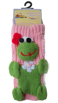 These Froggy Slipper Socks are warm, soft, and comfy. They are absolutely adorable. Predominately pink in color, they have a 3D design of a little green dress with a pink & white flower at the neck. To go with her dress, Froggy wears a red bow in her hair. At the bottom of the sock are little non slip grippers so that all the parading around the house can be done in safety. When the parade ends, Froggy is machine washable.