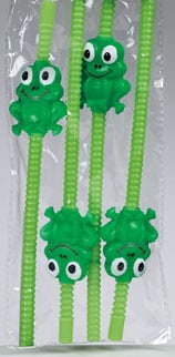 An attractive set of 4 plastic drinking straws, light green in color, with an adorable little smiling frog clutching its round belly, seated on top of the straw.