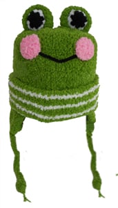 Super Soft and Snuggly, this fun inspired hat is a must for brisk wintry days. Put a smile on everyone’s face, including your own when this adorable green faced frog with big pink round cheeks,black and white crocheted popping eyes, and attached earmuffs for added warmth, is worn . Keep your head toasty warm, and keep the smiles coming!