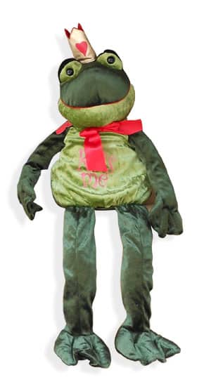 Made of green shiny satin material. Gorgeous! The kind of thing you would see in a fairy tale exhibit or children’s museum. Just too frog-tastic for words. BIG ! You could hold it in your arms and ‘dance’ with it – likley it’s almost as tall (or taller) than you ! We put ours in a rocking chair. Check out the whimsical medieval hat and the kiss me shirt !