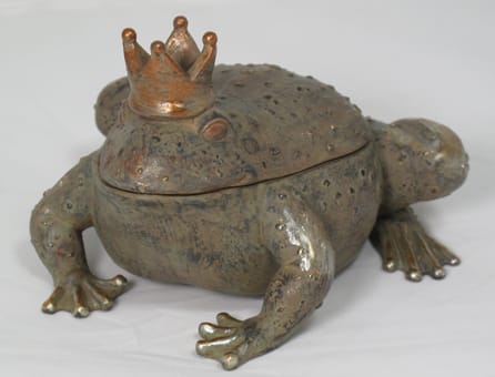 Wearing a crown, this large Frog Prince, a mottled green/gold in color, was inspired by figurines suitable for garden display. With his top half cover removed, he would make a handsome planter. He, however, would be right at home on the inside, used as a box with various items of your choice. He is delightfully versatile and of course, a good looking specimen.